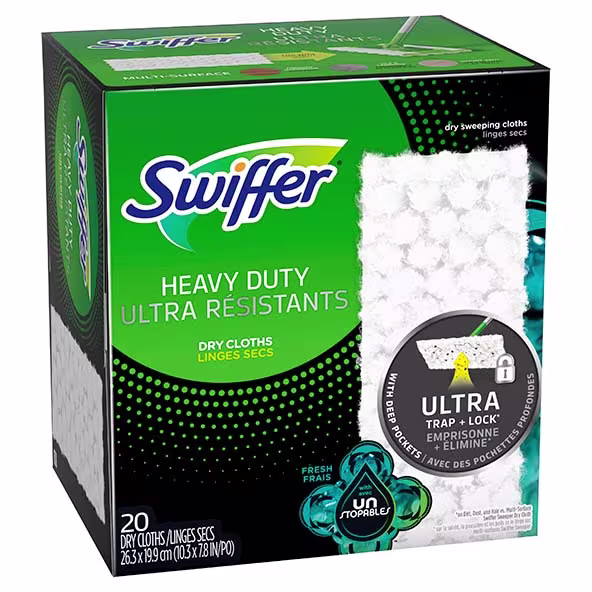 Swiffer Sweeper Heavy Duty Multi-Surface Dry Sweeping Cloths remove up to 95% of allergens* and TRAP + LOCK™ 2X more dirt, dust, and hair**, allowing you to clean all your hard floor surfaces quickly and easily. Use with your Swiffer Sweeper Dust Mop - the convenient combination of a broom and mop for a quick and easy clean. *Common inanimate allergens from cat and dog dander & dust mite matter **vs. Multi-Surface Swiffer Sweeper Dry Cloth